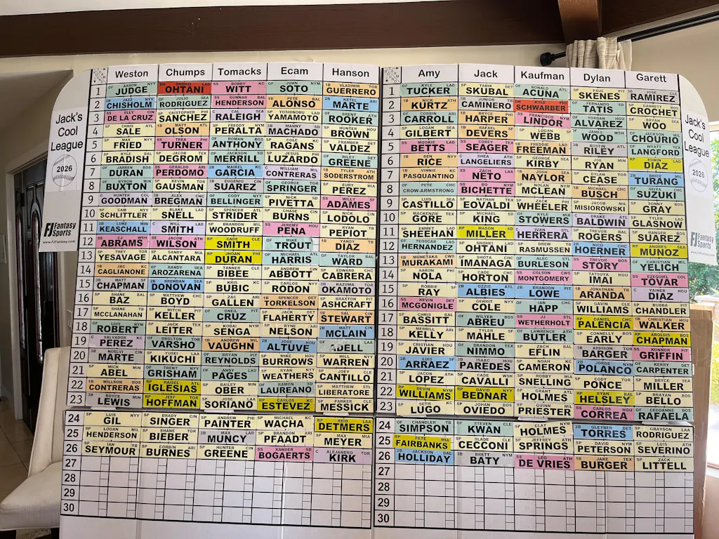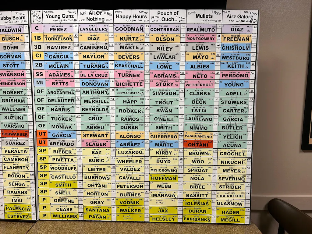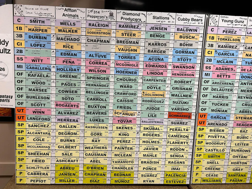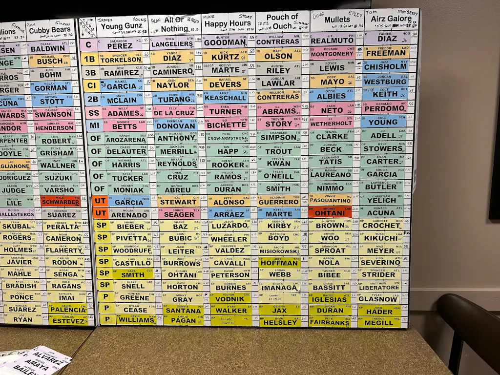 - (2) printed labels of your league name - one label for each vertical panel on each side of the draft board - with year inside of a baseball